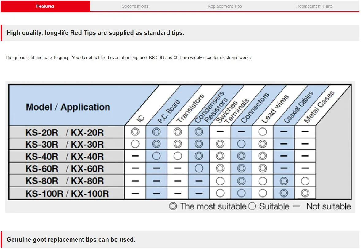 The goot Red Tips are genuine, long-life replacement tips. Made of iron-plated copper, coated with aluminum. 10 to 20 times longer life than normal copper tips. Hi-precision processed tips achieve extremely accurate soldering work. The goot Black Tips are made of copper, are iron plated, and covered with heat resistant coating.